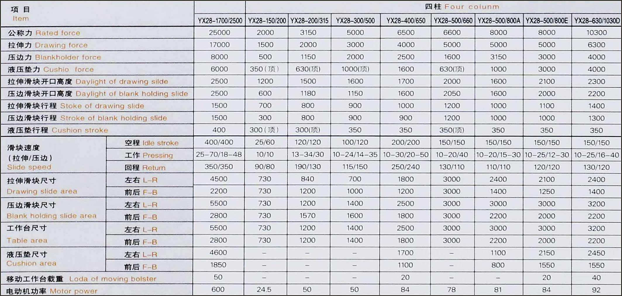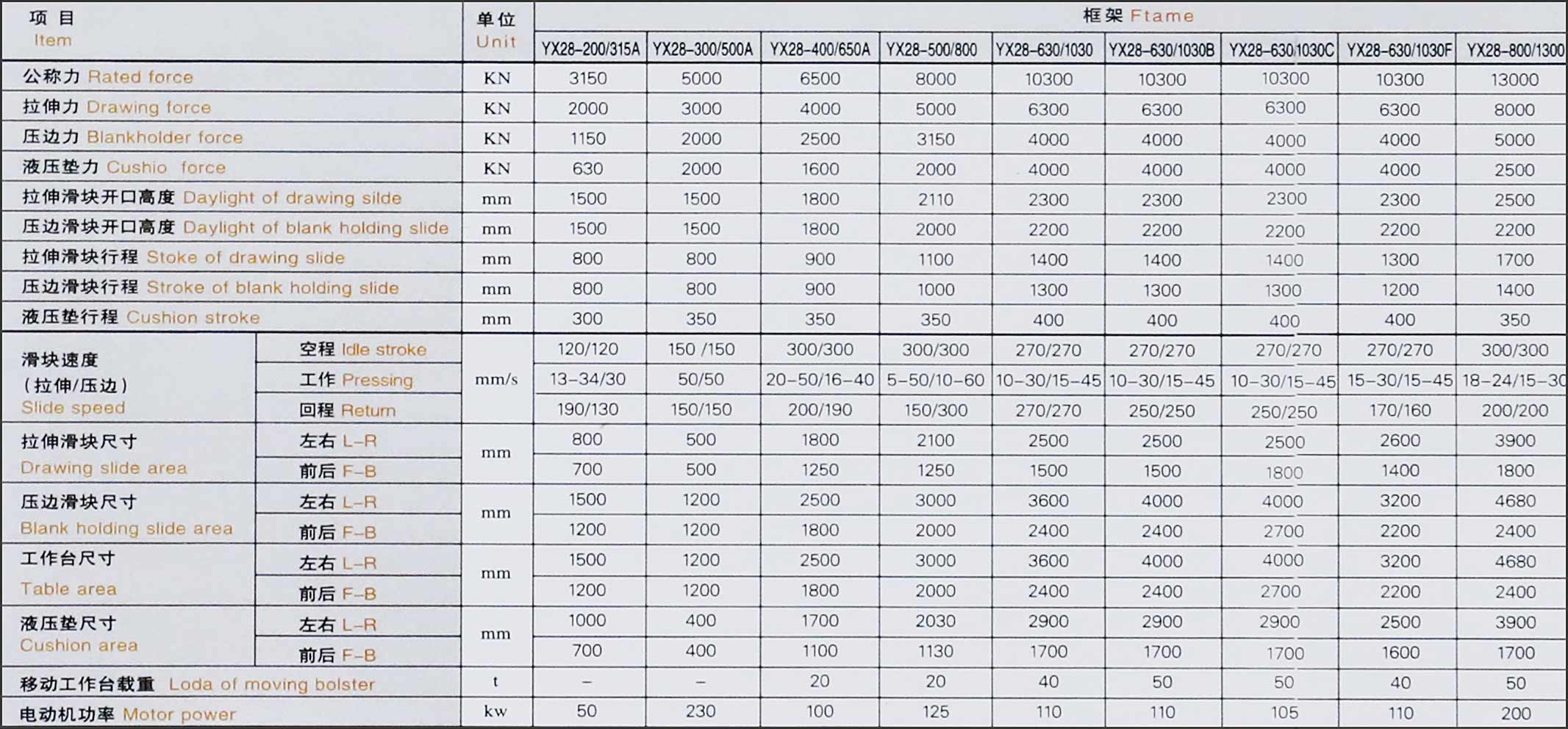 | 移動工作臺 | 沖裁緩沖裝置 | 壓邊滑塊,液壓墊死角分別調(diào)壓裝置(拉伸不對稱零件) | 光電保護(hù)裝置 | 換模用浮動導(dǎo)軌和滾動托架 |